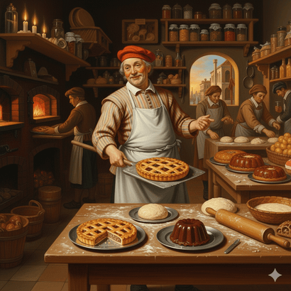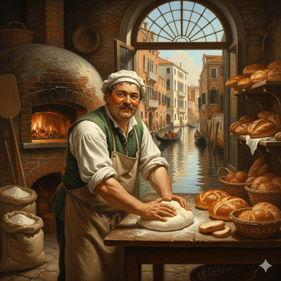 Pistor – fornaio o panettiere; Questo termine deriva direttamente dal latino pistor-ōris, che significava originariamente “chi pesta i cereali nel mortaio” e poi “panettiere”. È un termine ancora ben diffuso a Venezia. In città è comune trovare riferimenti a questa figura storica, come ad esempio la “Calle del Pistor”, che indica la strada dove si trovava una volta un forno o una bottega di panettiere.